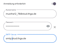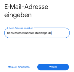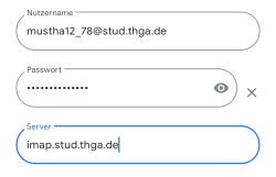 Geben Sie unter Nutzername den generierten Benutzernamen an. Wechseln Sie ggf. wieder in den Browser um diesen anzuzeigen. Der generierte Benutzername hat dieses Format: loginid_zahlen@stud.thga.de, also z. B. mustha12_78@stud.thga.de