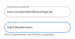 Kontrollieren Sie, dass der Kontoname Ihre Email-Adresse (vorname.nachname@stud.thga.de) anzeigt und geben Sie unter "Mein Name" Ihren Vornamen und Nachnamen an, damit dieser bei den Empfängern korrekt angezeigt wird. Bestätigen Sie mit Weiter.