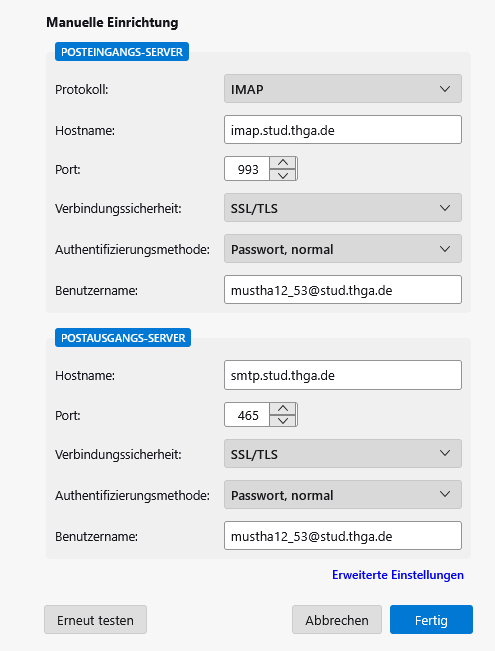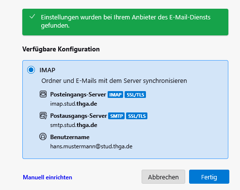 Geben Sie unter Benutzername den generierten Benutzernamen an. Wechseln Sie ggf. wieder in den Browser um diesen anzuzeigen. Der generierte Benutzername hat dieses Format: loginid_zahlen@stud.thga.de, also z. B. mustha12_78@stud.thga.de. Klicken Sie auf Fertig um die Einrichtung des Postfachs abzuschließen.