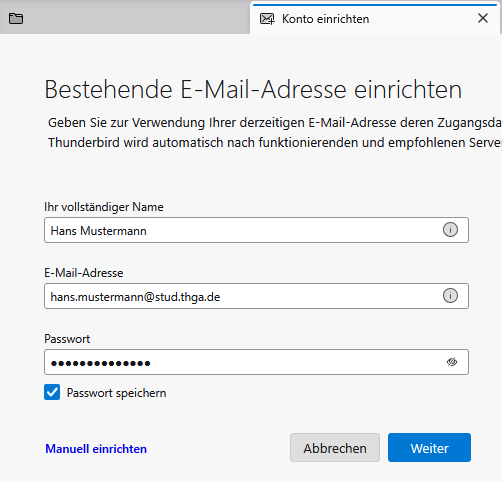 Nach der Installation von Thunderbird (https://www.thunderbird.net/de/) geben Sie im Fenster "Konto einrichten" Ihren Vornamen und Nachnamen, so wie Ihre Email-Adresse (vorname.nachname@stud.thga.de) und das am Anfang erstellte App-Passwort in das Formular ein. Klicken Sie auf Weiter